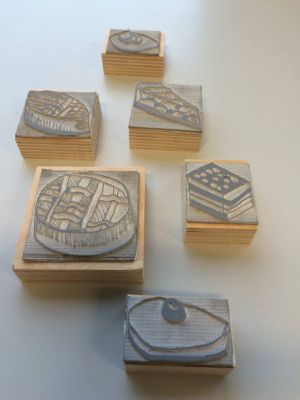 Het stempelrubber is gelijmd op kleine multiplex blokjes.